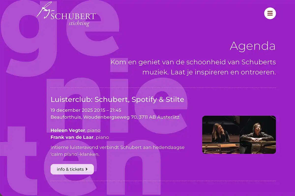 Schubert dood? Dat had je gedacht! Ook al schreef Schubert zijn muziek meer dan twee eeuwen geleden, zijn werk is nog altijd heel toegankelijk en gaat vaak over onderwerpen die ons ook vandaag nog bezighouden: eenzaamheid, moeilijke beslissingen nemen, liefdesverdriet, migratieproblematiek of de relatie tussen de mens en de natuur. De Schubert Stichting wil Schuberts muziek levend houden en en weer in de spotlight zetten. En dat op een manier die past bij onze tijd.